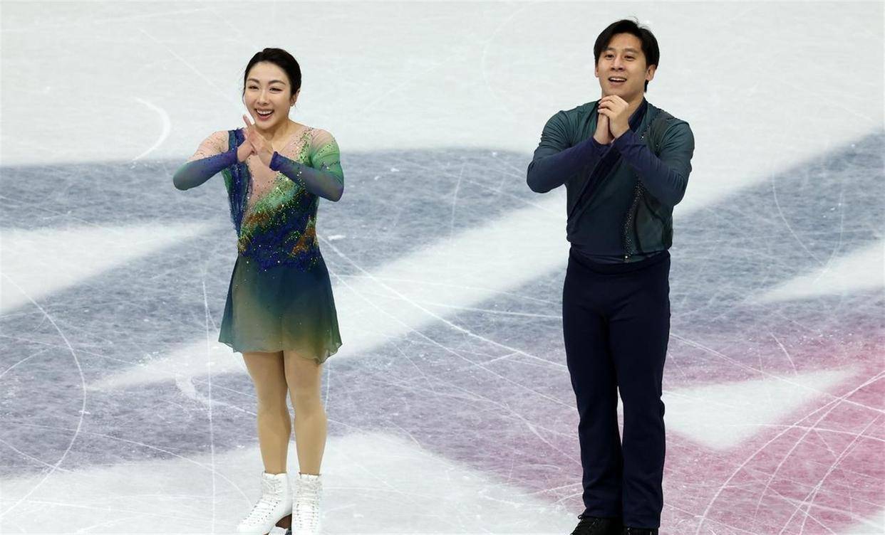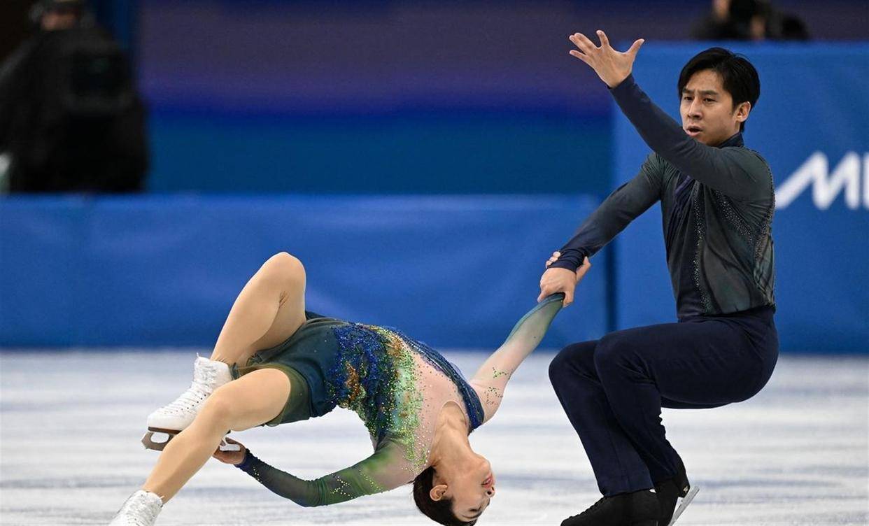 这个比赛日产生的六枚金牌被六个不同的国家瓜分。 中国队只在其中一个项目上站上了领奖台。 花样滑冰双人自由滑的赛场成了当晚最受瞩目的焦点。 卫冕冠军、中国组合隋文静和韩聪在《只此青绿》的悠扬乐声中,完成了他们职业生涯的第三次冬奥之旅。 短节目他们得到72.66分排名第六。 自由滑中,两人身着青绿色调的比赛服,将中国古典山水画的意境与冰上技术动作深度融合。 开场后外点冰三周跳,隋文静落冰时出现翻身失误,但随后的捻转三周、抛后内点冰三周等高难度动作均高质量完成。