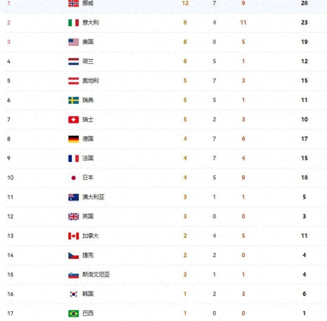 截至2月17日凌晨,2026年米兰冬奥会116枚金牌已产生74枚。 奖牌榜上,挪威12金7银9铜共28枚奖牌排名第一。 意大利8金4银11铜共23枚奖牌排名第二。 美国6金8银5铜共19枚奖牌排名第三。 荷兰6金5银1铜排名第四。 奥地利5金7银3铜排名第五。 日本队凭借双人滑金牌,以4金5银9铜共18枚奖牌继续排在第十位,稳居亚洲各代表团之首。 中国队以0金3银2铜共5枚奖牌排名第19位。 本届冬奥会获得奖牌的国家已达到26个。